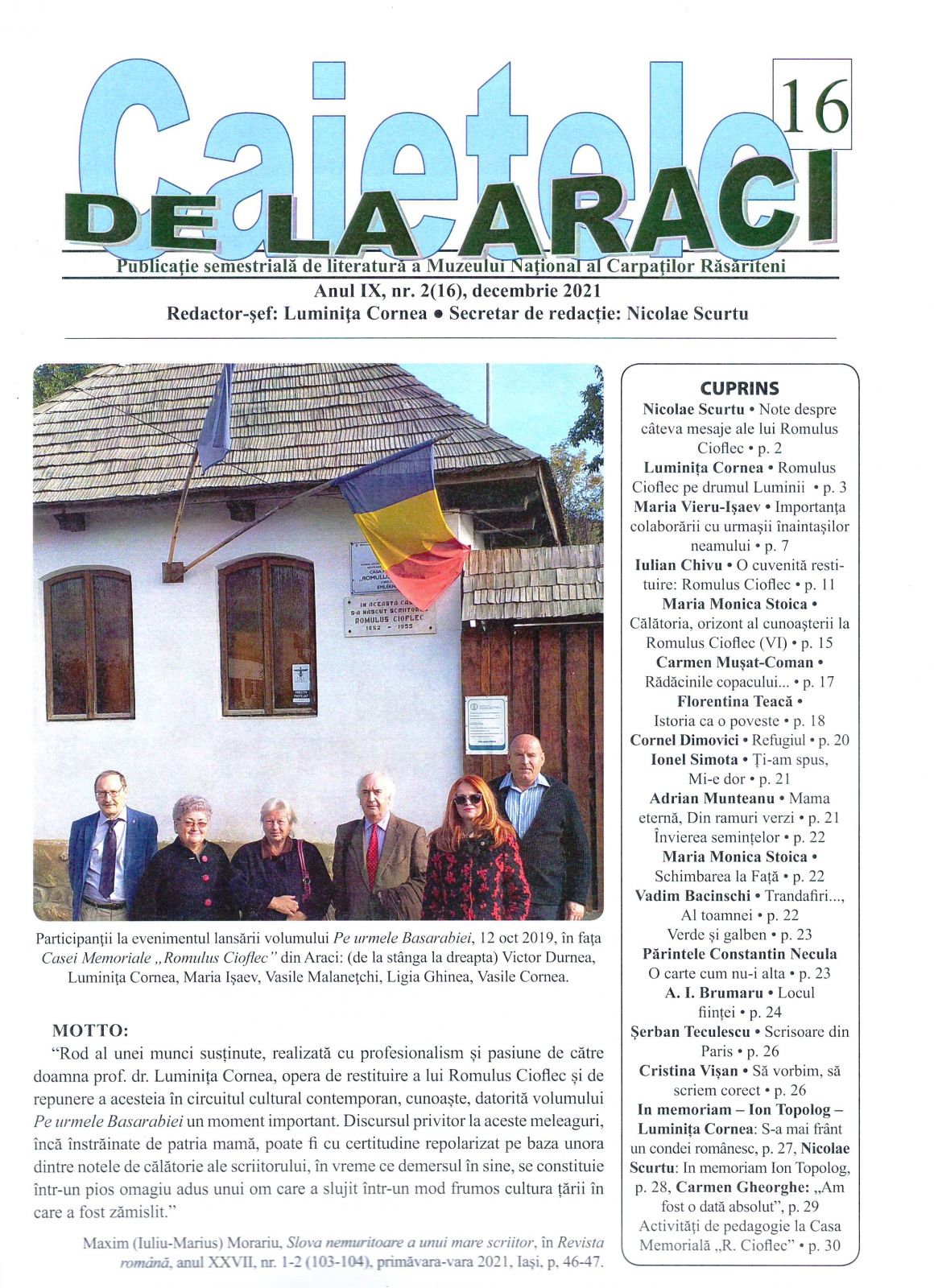 Numărul 16 din publicația de literatură a Muzeului Național al Carpaților Răsăriteni ''Caietele de la Araci'', anul IX,nr.2 (16), decembrie 2021.