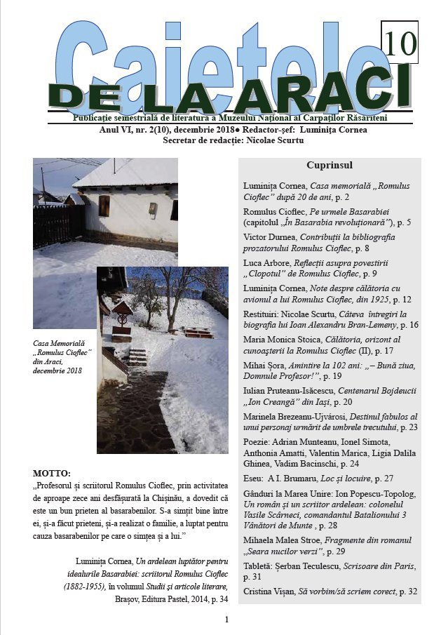 Numărul 10 din publicația de literatură a Muzeului Național al Carpaților Răsăriteni ''Caietele de la Araci'', anul VI, nr.2(10), decembrie 2018.