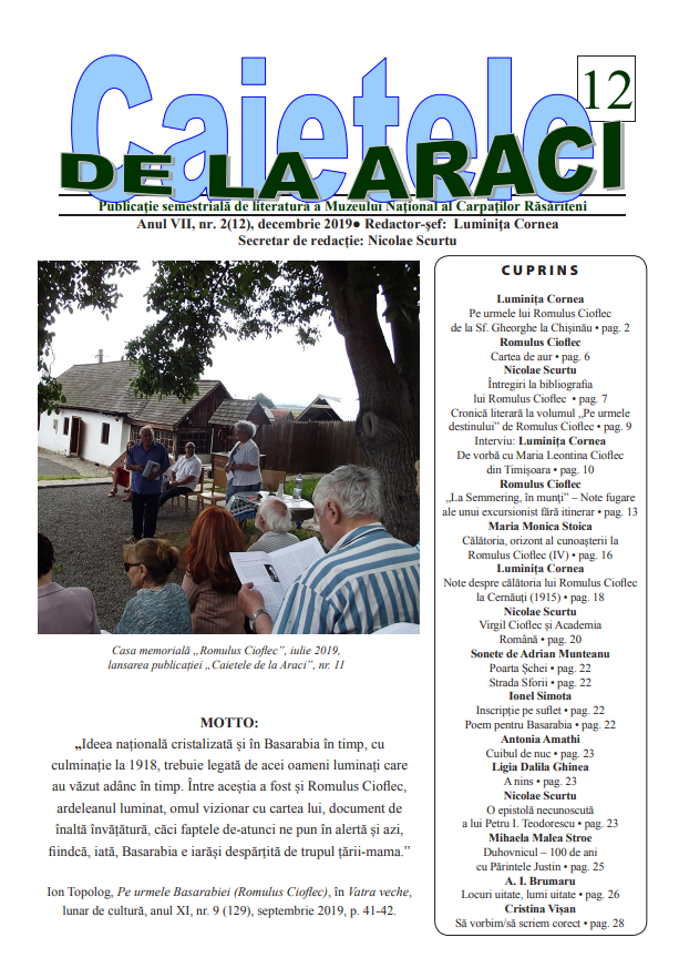 Numărul 12 din publicația de literatură a Muzeului Național al Carpaților Răsăriteni ''Caietele de la Araci'', anul VII,nr.2(12), decembrie 2019.