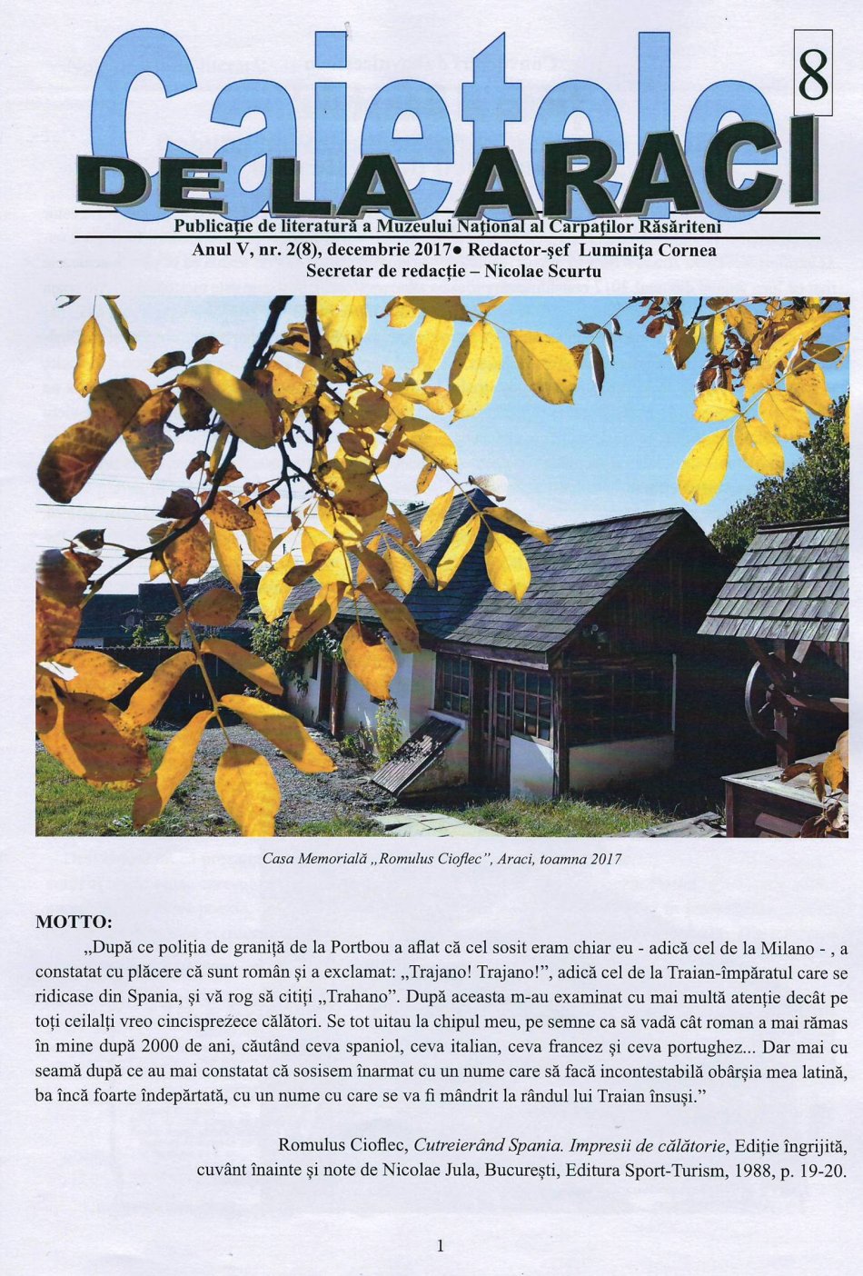 Numărul 8 din publicația semestrială ''Caietele de la Araci'' (Anul I, nr. 1, decembrie 2013 – Anul V, nr. 2(8) decembrie 2017), revistă de literatură editată de Muzeul Național al Carpaților Răsăriteni, redactor-șef Luminița Cornea.